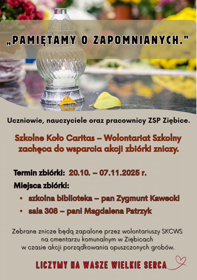 Szkolne Koło Caritas – Wolontariat Szkolny organizuje zbiórkę zniczy. Akcja pod hasłem „Pamiętamy o zapomnianych” trwać będzie w naszej szkole od 20.10.2025r. do 07.11.2025r. Zebrane znicze zostaną zapalone przez wolontariuszy na zaniedbanych, opuszczonych grobach na cmentarzu komunalnym w Ziębicach w czasie akcji porządkowania opuszczonych grobów.